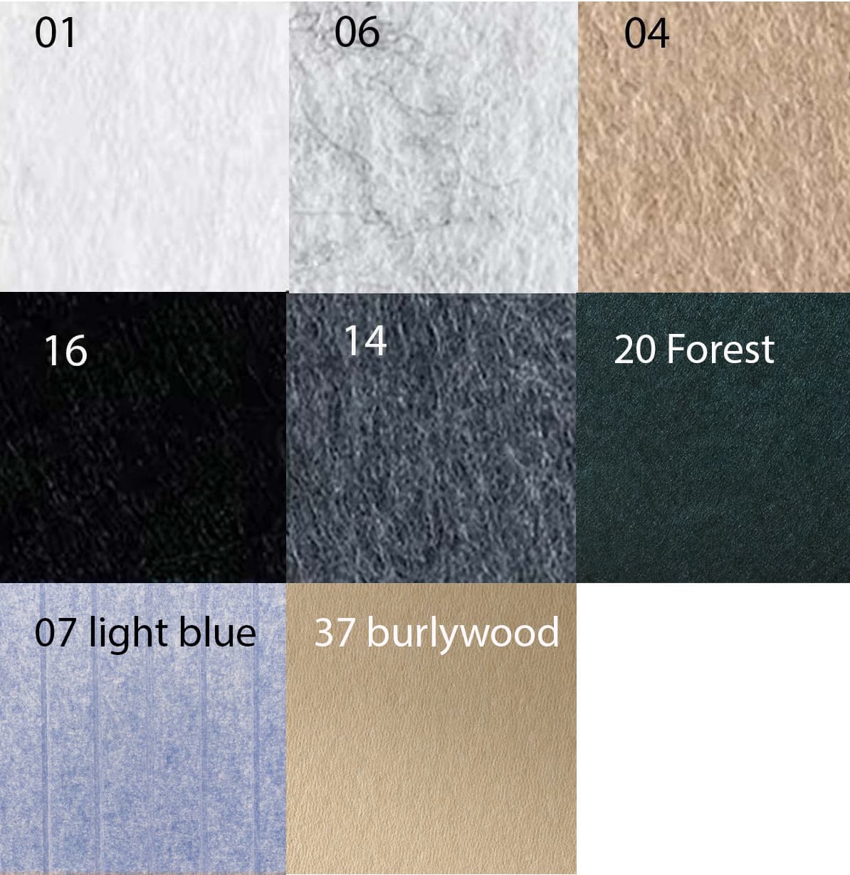 | Couleur | 01 White, 04 Beige, 06 silver, 07 light blue, 14 Dark grey, 16 Black, 20 forest, 37 burlywood |